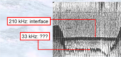 High echosounder frequencies (210 kHz) are reflected on top of the