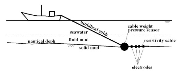cable is floating above the solid/fluid mud interface fluid mud and/or